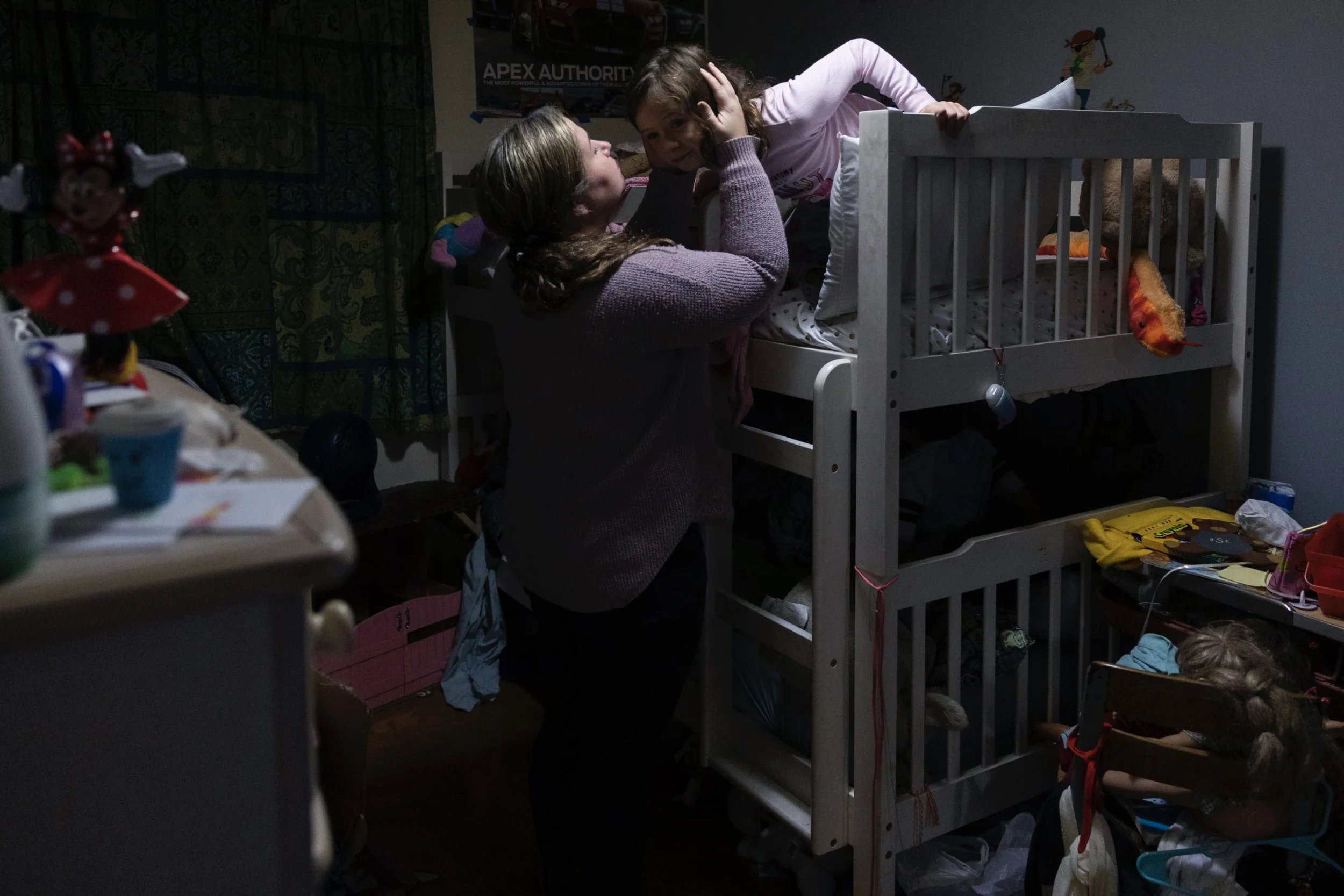 Jennifer Simpkins says goodnight to her daughter Evelyn Simpkins, 10, at their home in Downingtown, Pennsylvania on October 27, 2021. The shock of the pandemic threw care taking arrangements into disarray, with many families finding themselves back in the same precarious arrangement they had before, with the burden still on mothers. (For The New York Times)