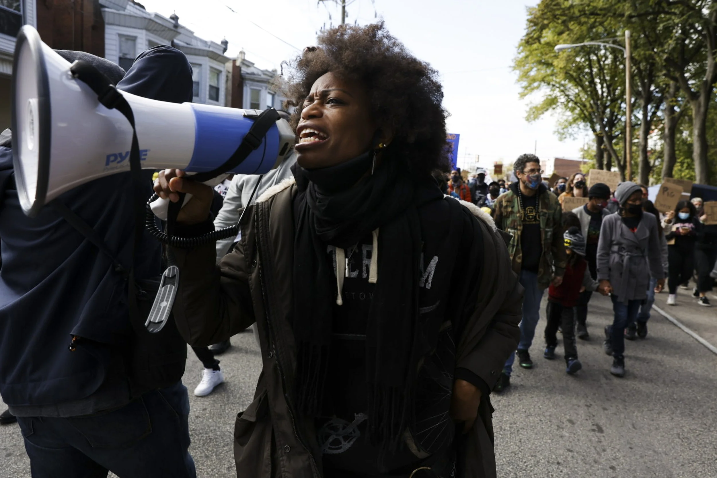Community activist Yahné Ndgo leads a crowd of over 500 people marching to protest the killing of Walter Wallace Jr. in West Philadelphia on October 31, 2020. (For The Washington Post)