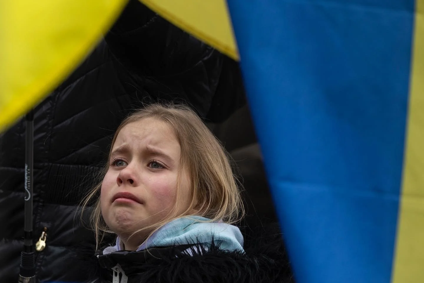Bozhena Denisova, 9, cries as she marches against Russia’s invasion of Ukraine during a rally in Philadelphia, Pennsylvania on March 27, 2022. (For Reuters)