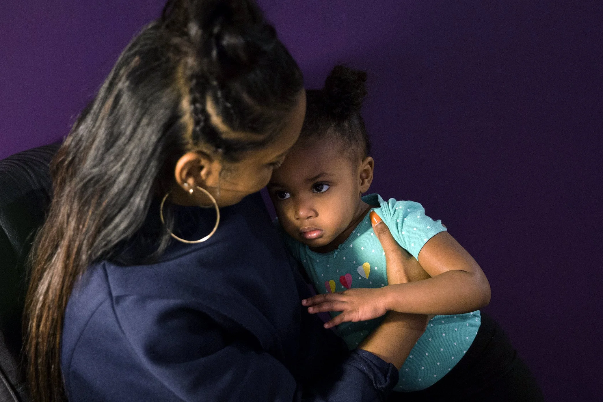 Midwife Asasiya Muhammad (left) hugs two year old Annalulu Ndanu in her office at Inner Circle Midwifery on February 9, 2019. Muhammad is the only Black midwife in Philadelphia, and has delivered Annalulu and her siblings. (For WHYY)