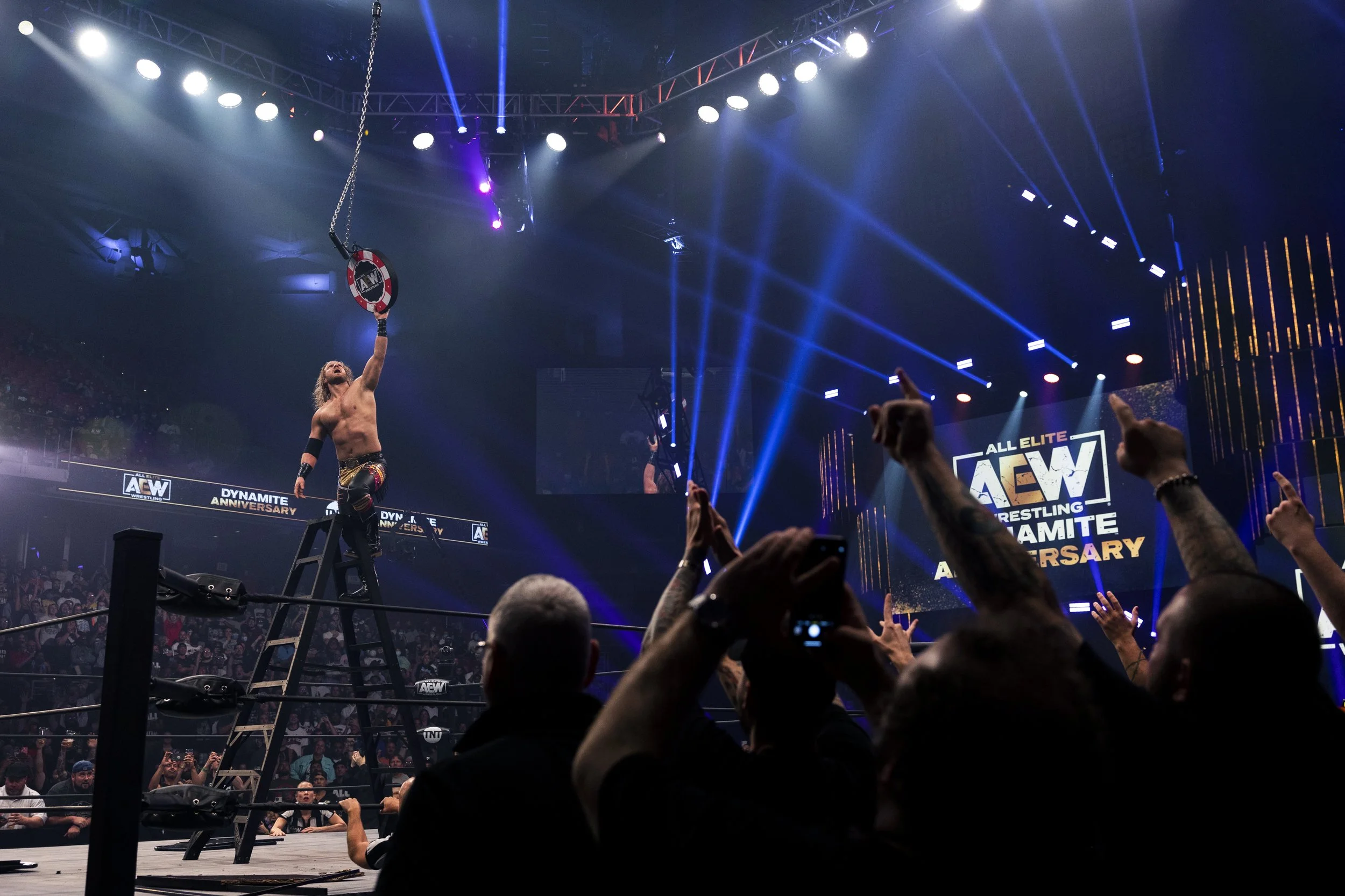 Adam Page claims victory in the Casino Ladder Match at the AEW Dynamite show in Philadelphia on October 6, 2021. (For The Washington Post)