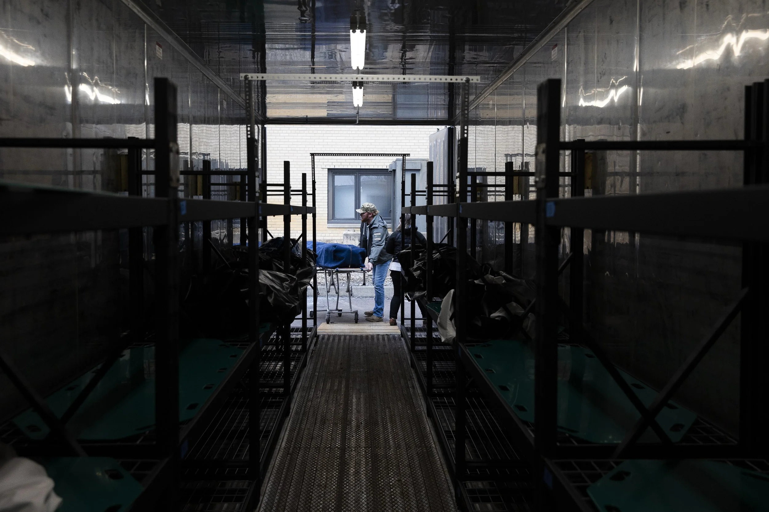 Bill Pheasant, Snyder County Coroner, receives help from Montour County Deputy Coroner Brenna Dewalt in transporting a body of a person who has died of COVID-19 from Geisinger Medical Center in Danville, Pennsylvania to Pheasant’s funeral home in Snyder on January 13, 2021. (For The Washington Post)