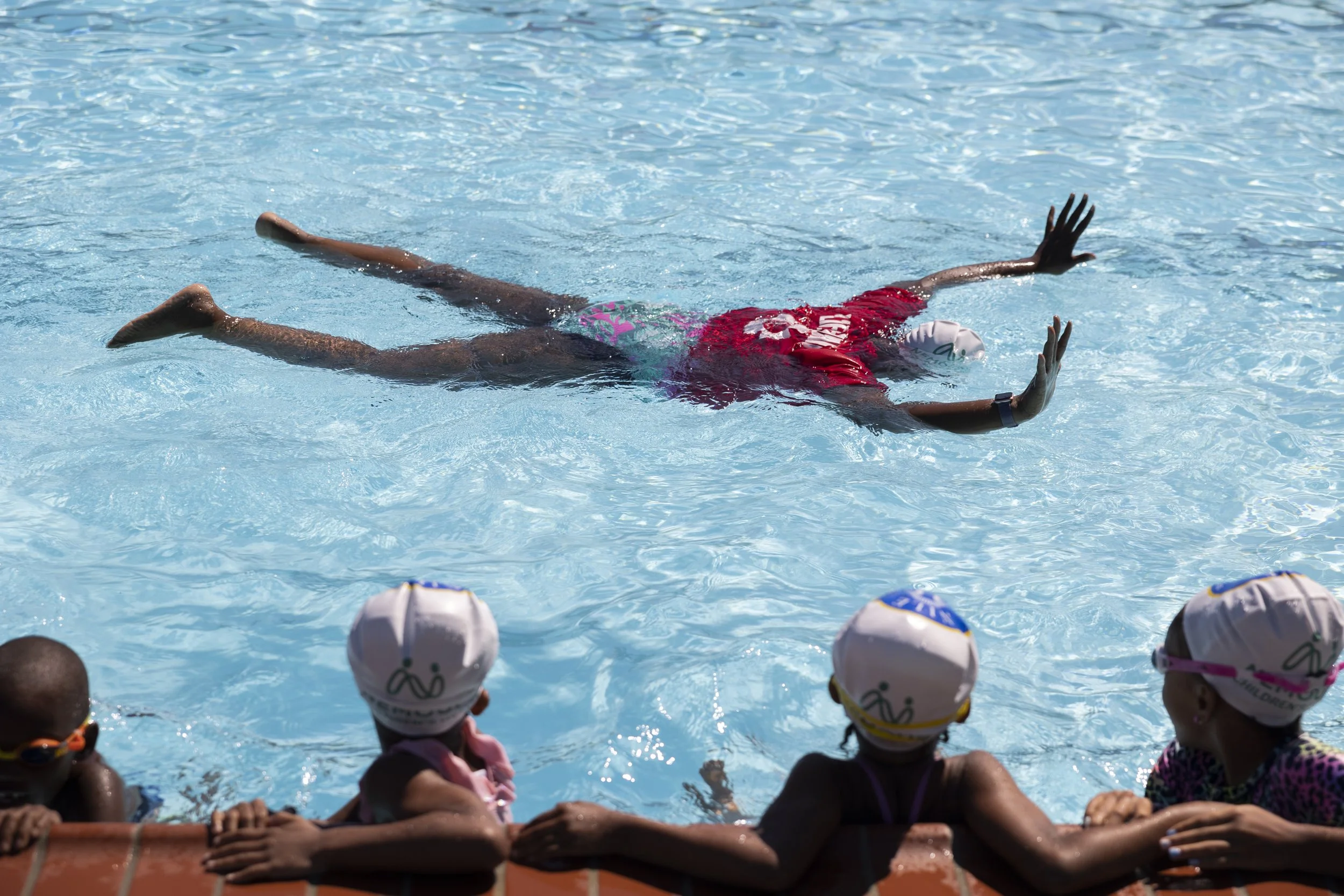 Lifeguard and swim instructor Tujuanna Jackson teaches children how to float and hold their breath under water at the free “No Child Will Drown In Our Town” program offered by Nile Swim Club in Yeadon, Pennsylvania on June 29, 2022. (For The New York Times)